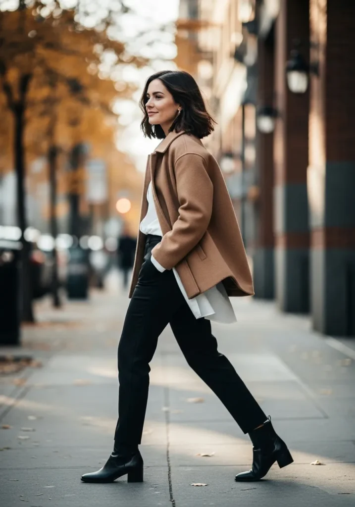 This chic look blends a camel jacket with a white top and slim black pants. Black heeled ankle boots finish the outfit with a clean and modern shape. The muted tones and sleek layers make it ideal for a stylish fall day.