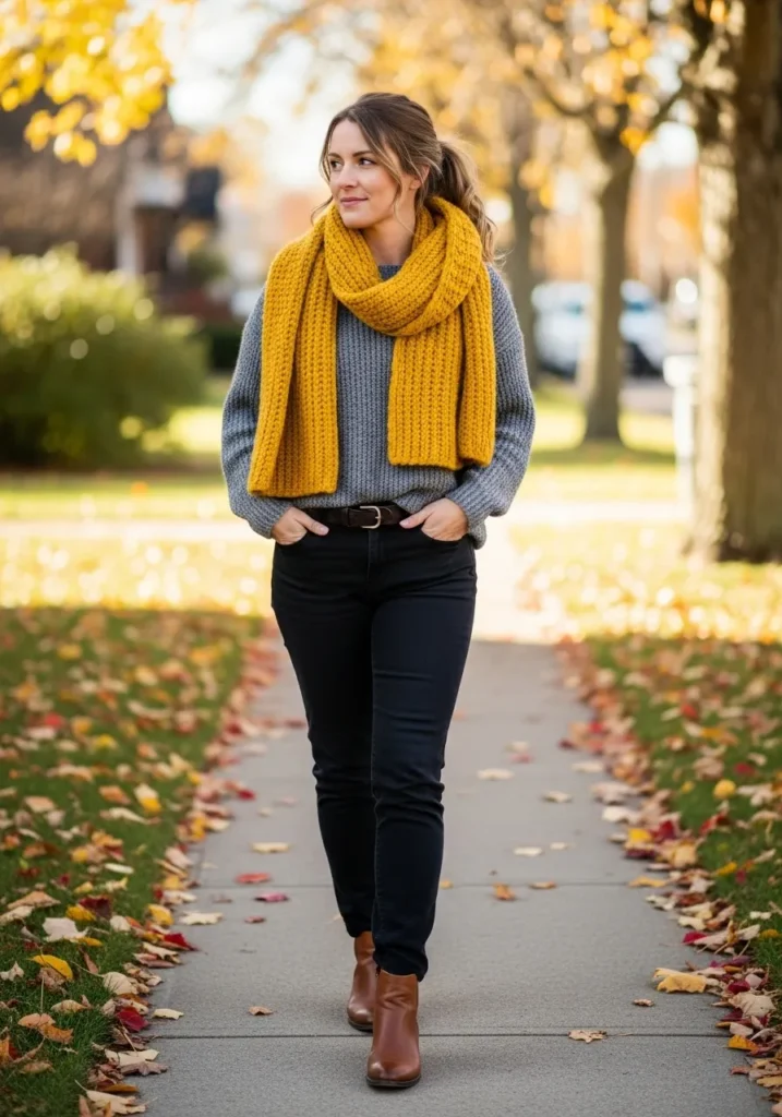 This cozy outfit pairs a chunky mustard scarf with a soft gray sweater and slim black jeans. Brown ankle boots complete the look and the warm scarf pulls everything together with a bright fall touch.