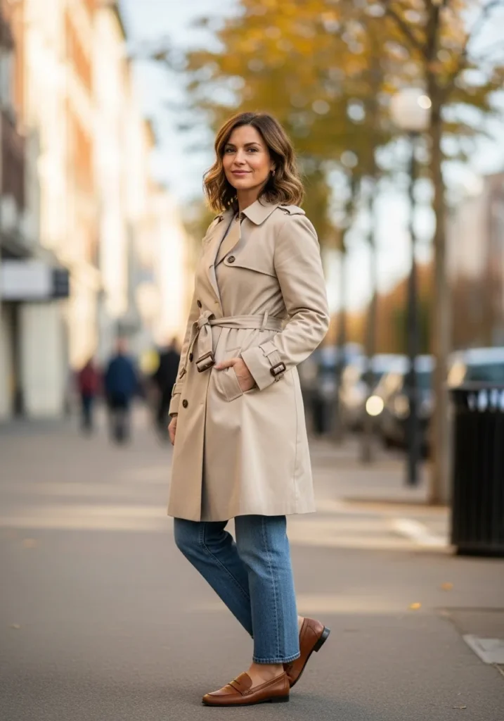 A beige trench coat, cropped jeans, and brown loafers create a refined daytime outfit. The coat ties at the waist for a flattering shape and the loafers add a classic touch.