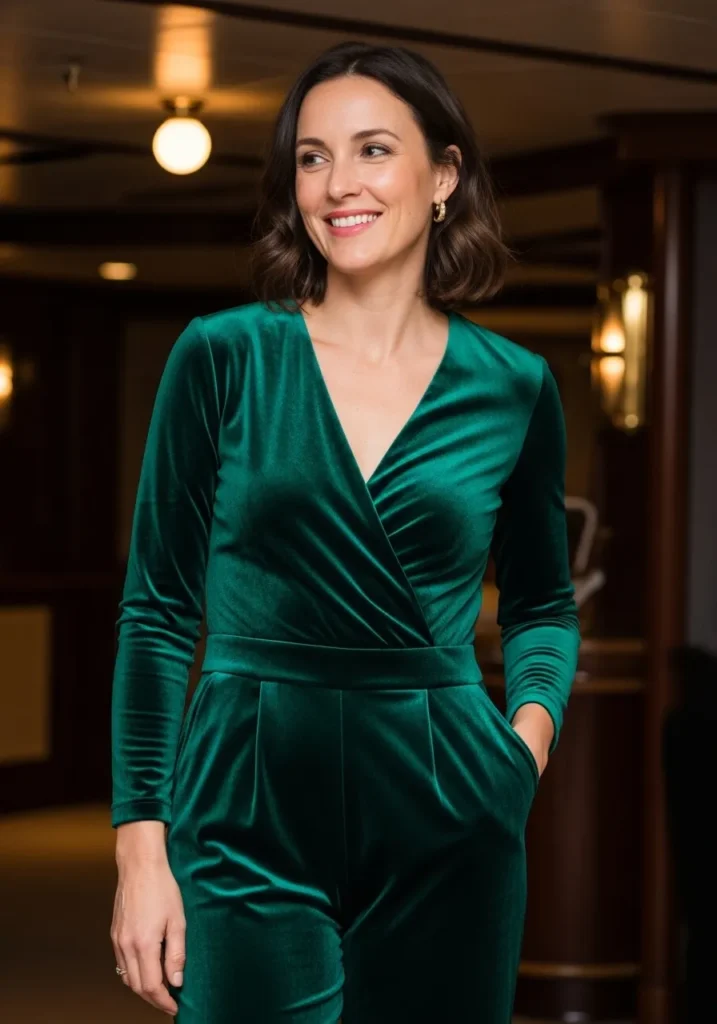 I adore how velvet jumpsuits make me feel both relaxed and dressed up. The fabric is soft and warm which is ideal for an evening at sea and the color feels bold in the best way. It is a great pick when I want something chic but still easy to move in while celebrating New Year’s Eve.