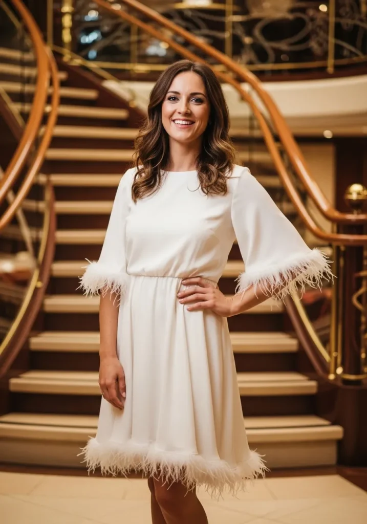 I adore how this dress feels both sweet and stylish. The feathers give just enough personality without feeling loud and the white color always looks fresh against the warm lighting on a cruise. It is the kind of outfit that instantly lifts my mood because it feels playful and polished at the same time.