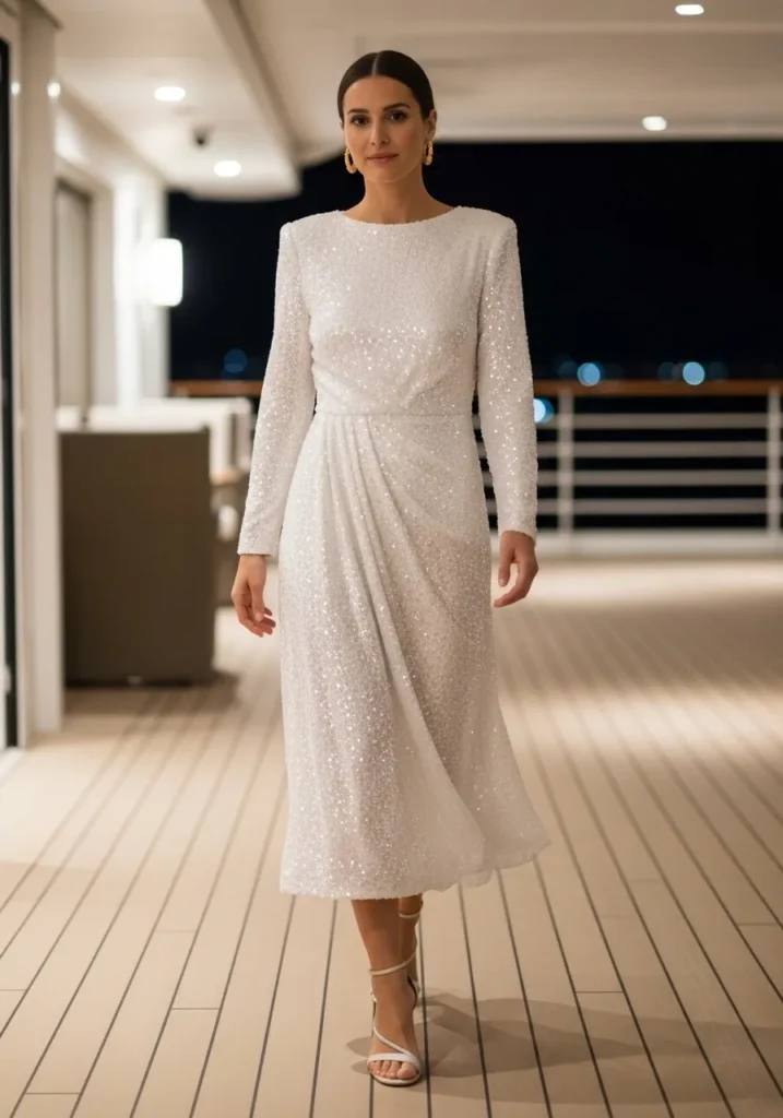 This dress glows softly with white sequins that sparkle in a delicate, refined way. The long sleeves and high neckline keep the look modest while the gathered waist adds shape and movement. The midi length gives it a graceful finish and the light fabric flows gently when walking along the deck.