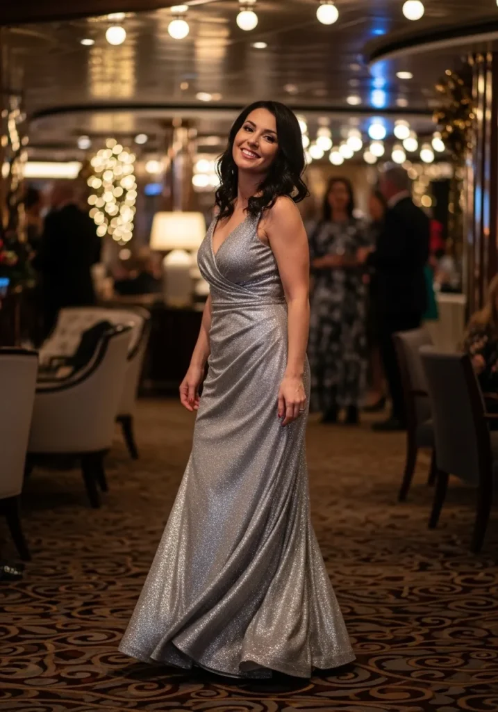 I always feel so special in a gown like this. The shimmer feels magical without overwhelming the silhouette and the cut flatters in all the right places. It is the kind of dress that makes a cruise New Year’s Eve feel even more memorable.