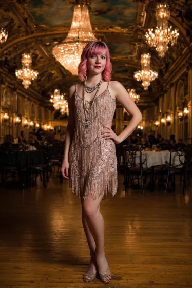 This look is pure vintage sparkle with a touch of attitude. The pink hair instantly sets a playful tone, and pairing it with a champagne-toned fringe dress creates a stunning flapper-inspired outfit. The layered necklaces add extra detail, and the strappy heels keep the whole ensemble chic and party-ready. With the chandeliers and ballroom setting behind her, it feels like she just stepped straight out of a glamorous 1920s soirée.