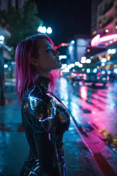 This outfit is straight out of a neon dream. The sleek black bodysuit shines under the city lights with metallic reflections that look almost electric. Paired with her bold pink hair, the whole vibe screams futuristic warrior ready to rule the night. The rainy streets and glowing reflections only add more drama, making this look feel cinematic and powerful.