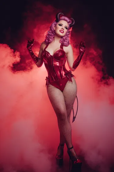 This outfit brings all the drama in the best way. The glossy red corset with matching gloves and fishnet tights creates a bold, figure-hugging look that oozes confidence. Her pink curls add a playful twist to the fiery aesthetic, while the devil horns and platform heels complete the costume perfectly. Surrounded by smoky red lighting, the whole scene feels powerful and theatrical.