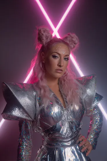 This outfit is a metallic masterpiece with serious futuristic vibes. The structured silver dress with exaggerated shoulders feels bold and commanding, almost like armor for an intergalactic ruler. Her pastel pink hair styled into playful space buns adds a softer touch, while the glittery makeup across her face ties the whole cosmic look together. The glowing pink neon lights in the background make it feel straight out of a sci-fi fantasy.