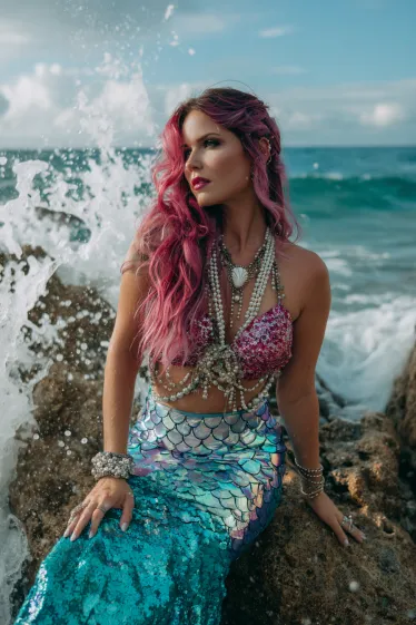 This outfit is full-on ocean glamour. The sequined mermaid tail shimmers in shades of turquoise and blue, catching the light like real scales. Her seashell-inspired top, layered with pearls and ocean-themed jewelry, adds a bold and beautiful touch. The wavy pink hair looks gorgeous against the beach backdrop, making her look like she just emerged from the sea itself.