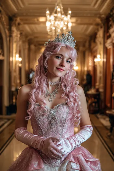 This outfit is pure royalty with a touch of sparkle. The shimmering pink gown features a corset bodice covered in glittering details and a full layered skirt that flows with elegance. Long satin gloves and a sparkling jeweled tiara complete the princess vibe, while her soft pink curls tie the whole look together beautifully. Surrounded by chandeliers and ornate hallways, it feels like she just stepped out of a storybook castle.
