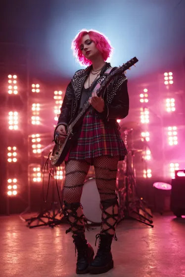 This outfit is edgy, loud, and full of attitude. The studded leather jacket layered over a black top brings instant rocker energy, while the red plaid skirt and fishnet tights keep the look rebellious and fun. The lace-up boots add toughness, and the bold pink bob hair makes the whole costume pop under the stage lights. With a guitar in hand and glowing pink spotlights behind her, the vibe is pure rock star.