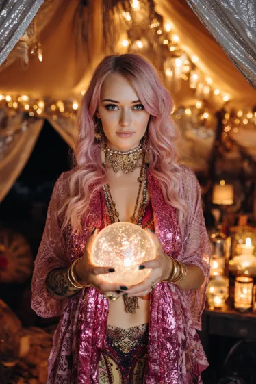 This outfit is layered with rich textures and sparkling details that instantly draw you in. The flowing pink shawl, ornate jewelry, and patterned fabrics create a luxurious bohemian look. Her soft pink hair cascades in loose waves, perfectly framing her face as she holds a glowing crystal ball. Surrounded by warm golden lights inside a tent, the whole setting feels magical and mysterious.