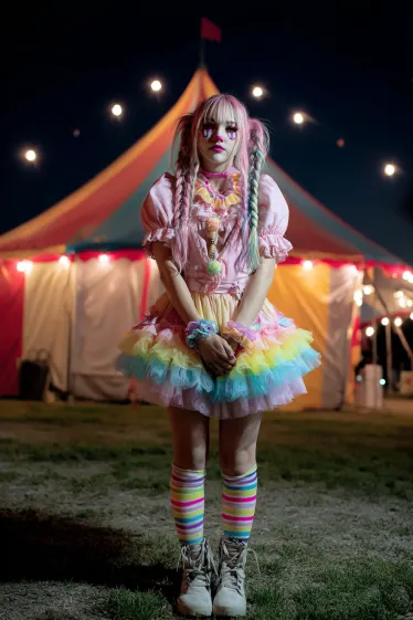 This outfit is a burst of color and fun. The frilly tutu skirt mixes rainbow layers of tulle with a bright pink puff-sleeve top, creating a whimsical doll-like effect. Her pink braids add to the playful vibe, while striped knee-high socks and chunky boots balance the sweetness with a little edge. The circus tent glowing in the background makes the whole costume feel right at home in a carnival setting.
