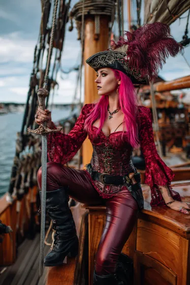 This outfit is packed with swashbuckling attitude and style. The deep red corset top with lace sleeves pairs perfectly with sleek leather pants, giving it both elegance and edge. Her tall black boots and feathered hat add dramatic flair, while the sword at her side makes the look complete. The bright pink hair takes this pirate queen vibe to another level, making it bold and unforgettable against the backdrop of a classic ship.