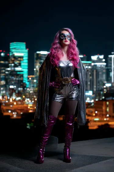 This outfit sparkles with bold, futuristic style. The metallic silver romper paired with a flowing cape instantly sets a heroic tone. Her tall magenta boots and matching gloves add a punch of color that ties beautifully with her wavy pink hair. The mask gives the look that mysterious superhero edge, and the glowing city skyline in the background makes it feel straight out of a comic book scene.