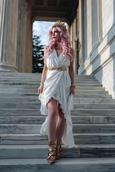 This outfit radiates divine elegance. The draped white gown with a golden belt is beautifully timeless, and the metallic crown adds a regal touch that feels straight out of mythology. Paired with strappy gold sandals and layered jewelry, the look is dramatic yet refined. Her soft pink curls bring a modern twist, making this goddess-inspired costume truly unique.
