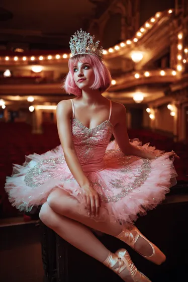 This outfit sparkles with delicate charm. The pink tutu dress is covered in glittering embellishments, catching the light beautifully under the theater chandeliers. Her soft pink bob and sparkling crown make her look like a ballerina straight out of a fairytale, while the pointe shoes add the perfect finishing touch to the graceful style. Sitting among the warm glow of the stage lights, the whole look feels magical and refined.