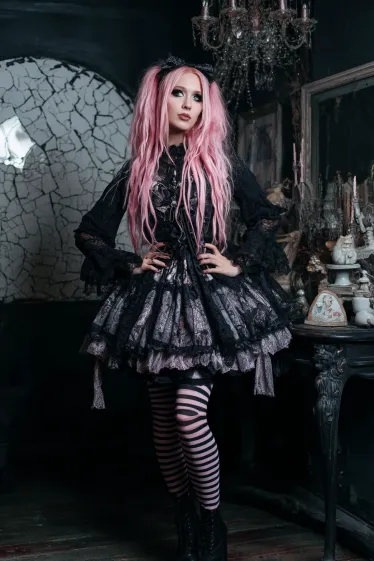 This outfit has that perfect spooky-meets-pretty vibe. The layered black lace dress with ruffled details creates a dramatic silhouette, while the striped tights add a playful touch. Her long pastel pink hair in twin ponytails softens the darker elements, making the whole look feel balanced and striking. The moody background with cracked walls and antique decor ties everything together in true gothic fashion.