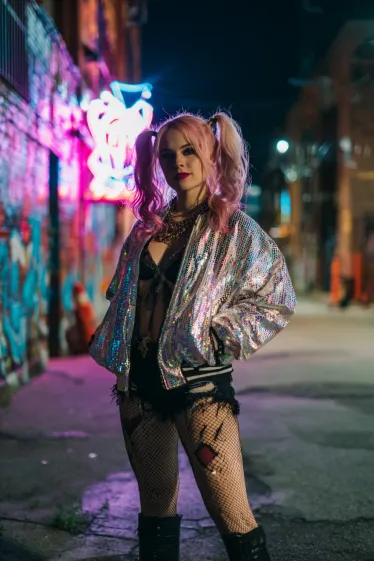 This outfit is bold, playful, and full of attitude. The shiny silver bomber jacket instantly catches the light, paired with ripped fishnet tights, black shorts, and chunky boots for that rebellious street-style vibe. Her pink pigtails give the look a flirty twist, while the layered necklaces and smoky makeup finish it off with just the right amount of edge. The neon graffiti background makes the whole costume even more striking.