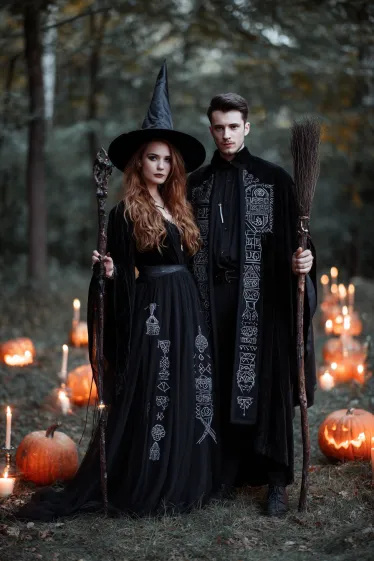 I absolutely love how coordinated this pair looks without being over the top. The matching symbols make the costumes feel unified, while the little details like the staff and broom keep it fun and spooky. It’s dramatic, but still wearable for a Halloween party or a themed event. If I saw a couple walk in wearing this, I’d instantly think they were the best-dressed in the room.