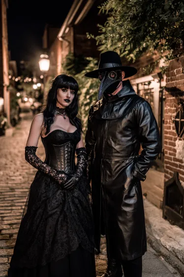 This couple’s costume brings together two darkly elegant styles. The woman is stunning in a black corset dress with layers of lace and a dramatic full skirt. Her look is topped off with long lace gloves, a black choker, and jet-black hair framing her pale makeup and bold lipstick. The man contrasts her beautifully in a full black leather plague doctor outfit, complete with the eerie bird-beak mask, a wide-brim hat, and gloves that make him look mysterious and unsettling. The cobblestone street setting only makes their appearance feel even more cinematic.