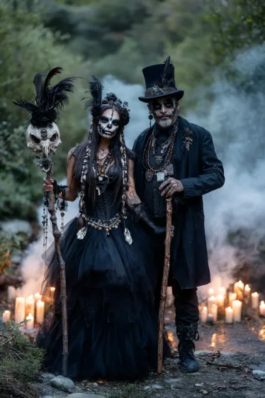 This couple’s costume is packed with mystery and drama. The woman is dressed in a layered black gown with a corset top, her look elevated by bone and feather accessories woven into her hair. Her skull-inspired face paint makes the outfit striking, while her tall staff topped with a skull decorated in feathers steals the show. The man complements her perfectly in a long black coat, wide-brimmed top hat, and layered jewelry, all finished with matching skeletal makeup. Together, they create a powerful presence, surrounded by candles and mist that make the vibe even more chilling.