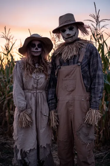 This couple’s outfit is all about creepy farm vibes with a spooky twist. The woman wears a tattered beige dress with frayed edges and straw details poking out from the sleeves and neckline. Her wide-brim hat and stitched scarecrow mask give her an eerie charm, especially paired with her haunting makeup. The man complements her perfectly in patched overalls, a plaid shirt, and a straw hat, with straw bursting out from his collar and cuffs. His burlap-style mask adds the finishing touch, making them look like they’ve stepped straight out of a haunted cornfield at dusk.
