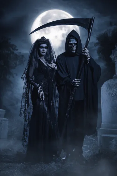 This couple’s costume is the definition of eerie elegance. The woman is dressed in a flowing black lace gown with sheer sleeves, her look topped with a dark veil and crown that give her a hauntingly regal presence. Her skeleton-style gloves add a spooky touch, making her look like a bride who’s risen from the grave. The man is dressed as the Grim Reaper, wearing a black hooded cloak with skeletal makeup and holding a massive scythe. The graveyard setting under the full moon ties it all together in the most chilling way.