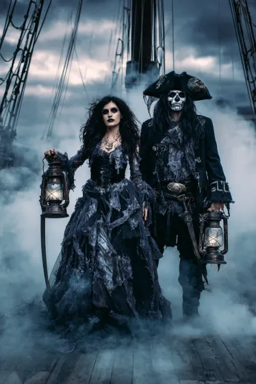 This couple’s outfit is all about haunting adventure on the high seas. The woman wears a distressed black gown with layers of tattered fabric that flow dramatically in the mist. Her makeup is dark and ghostly, with messy hair that makes her look like she’s risen from a sunken ship. The man matches her in a full pirate outfit, complete with a weathered tricorne hat, long coat, and skeletal face paint. Both hold lanterns that glow against the fog, making them look like cursed sailors lost at sea.