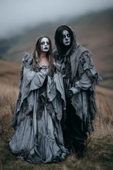 This couple’s costume has that eerie, lost-soul vibe that feels straight out of a ghost story. The woman wears a long, tattered gray gown with shredded layers that flow in the wind, her face painted pale with blackened eyes and streaks running down her cheeks. Her messy hair adds to the unsettling look, making her appear like a spirit wandering the hills. The man matches her perfectly in a hooded, shredded cloak with the same ghostly face paint. Together, they look like cursed wanderers forever bound to the misty landscape around them.