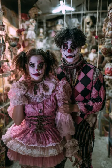 This couple’s costume blends playful colors with pure nightmare fuel. The woman is dressed in a frilly pink doll-like dress with layers of lace, puffed sleeves, and dark clown makeup that turns her sweet look unsettling. Her pigtails add to the creepy toy vibe, making her look like a broken doll come to life. The man complements her in a pink-and-black harlequin-style shirt with striped pants, his smeared clown makeup giving him a sinister edge. Surrounded by hanging dolls, they look like the stars of a twisted toy shop horror scene.