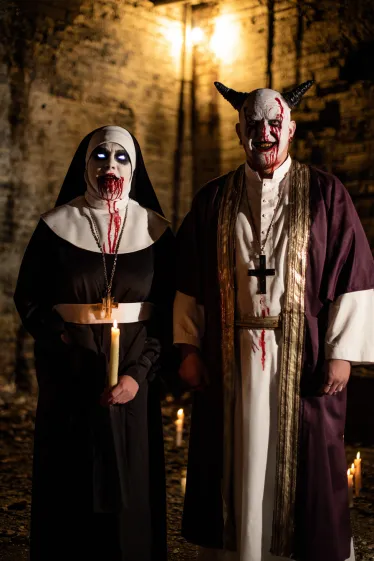 This couple’s outfit is dark, chilling, and unforgettable. The woman is dressed in a traditional nun’s habit, but her look is made terrifying with pale ghostly makeup, blackened eyes, and blood trickling down her face. She holds a candle that adds an eerie glow to her presence. The man matches her as a demon priest, wearing ceremonial robes with a large cross and bloody face paint. His horned headpiece and sinister expression complete the nightmarish vibe. Together, they look like they’ve stepped straight out of a horror film.