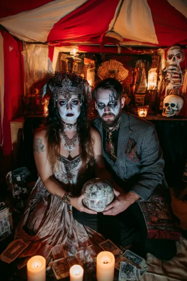 This couple’s costume feels mystical and haunting at the same time. The woman wears an elaborate gown with layered jewelry, a jeweled crown, and dramatic dark makeup that makes her look like an enchanted fortune teller. Her ghostly face paint adds a chilling twist to the mystical vibe. The man pairs with her in a vintage-inspired suit, draped with patterned fabrics, his face painted with dark streaks to give him a sinister, otherworldly look. Together, they hold a crystal ball surrounded by candles and tarot cards, making the whole scene feel like a séance gone wrong.