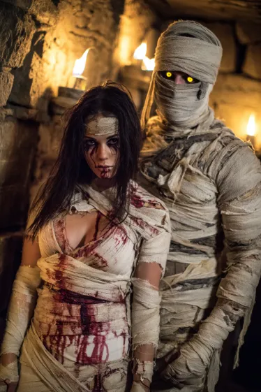This couple’s outfit is a spooky classic with a creepy twist. The woman is wrapped in distressed white bandages splattered with fake blood, her hair messy and her smoky makeup giving her a terrifying undead vibe. The man is fully wrapped from head to toe in aged bandages, with glowing yellow eyes peering out that make him look otherworldly. The stone walls and flickering torches behind them create the perfect ancient crypt setting, making their costumes even more dramatic.
