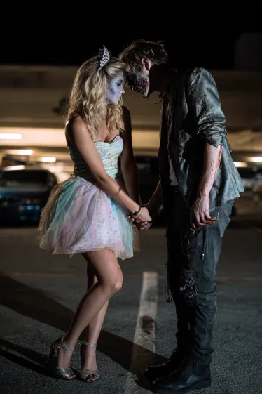 This couple’s costume is the perfect mix of sweet and scary. The woman wears a pastel rainbow dress with a flared skirt, sparkly heels, and a cute cat-ear headband that gives her a playful, princess-like vibe. Her makeup is soft but with just enough Halloween flair to tie it into the theme. The man contrasts her beautifully as a gruesome zombie, with torn, dirty clothes and terrifying face makeup that looks straight out of a horror movie. Their pose, holding hands under the harsh streetlights, makes the contrast between innocence and horror even stronger.