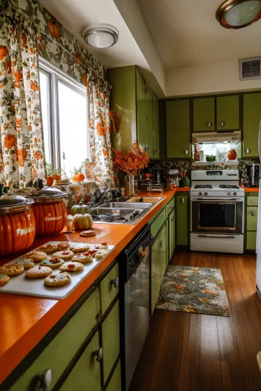 This absolutely adorable kitchen is a total throwback dream with its vibrant olive green cabinets, perfectly complemented by those cheerful bright orange countertops. The windows are dressed in the sweetest floral curtains, featuring little pumpkins and fall foliage, adding such a homey touch. You can spot a charming vintage-style stove and, oh my goodness, a tray of freshly baked cookies just waiting to be devoured on the counter. Pumpkin-shaped cookie jars and a delightful arrangement of dried fall botanicals complete this wonderfully nostalgic and festive space.