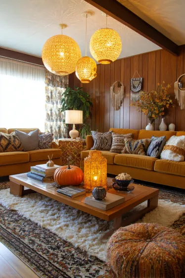 This absolutely fabulous living room is bursting with such a fun retro charm, thanks to its warm wood-paneled walls that give it an instant cozy vibe. The super plush mustard yellow sofas, piled high with an array of patterned and textured throw pillows, look incredibly inviting. Overhead, a trio of unique woven spherical pendant lights casts a soft, enchanting glow across the entire space. A stylish low wooden coffee table takes center stage, adorned with a plump orange pumpkin, a charming glowing lantern, and some neat decorative bits. Beneath your feet, a layered rug situation with a fluffy white one over a vintage pattern adds so much texture and warmth, perfectly complemented by a cute knitted ottoman and those gorgeous macrame wall hangings.