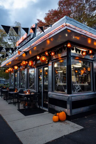 This super cool diner, with its classic chrome and black striped exterior, looks absolutely ready for a Halloween bash! A vibrant orange neon light traces the roofline, giving it that perfect retro glow. Strings of cheerful jack-o’-lantern lights and playful black bunting hang along the awning, adding such a festive touch. The large windows are adorned with whimsical spider web decals, hinting at the spooky fun inside. Outside, cozy tables are set up for outdoor dining, each with a small pumpkin centerpiece, and more pumpkins greet you right by the entrance.