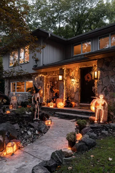 This inviting two-story home, with its natural stone facade on the ground level and light-colored siding above, looks absolutely enchanting as darkness falls. The front entryway is bathed in a warm glow from countless string lights that sparkle all around the porch and door. A winding stone path leads guests through a wonderfully decorated yard, filled with a playful mix of glowing jack-o’-lanterns and eerie-yet-friendly skeletons, including one sporting a witch’s hat. Festive lanterns with flickering candles also line the path and steps, adding to the magical atmosphere, while a charming fall wreath greets visitors at the door.