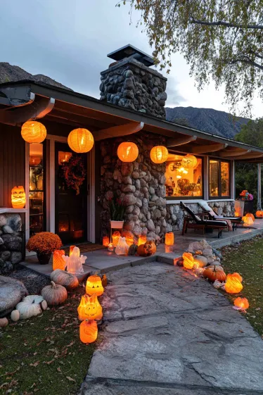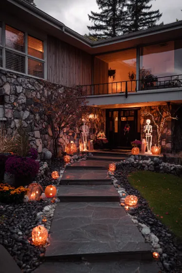 This absolutely fantastic mid-century modern home, with its sleek low-pitched roof and a cool mix of stone and wooden siding, really knows how to celebrate Halloween with style. Expansive windows frame the cozy interior, while a fun orange tinsel garland adds a festive pop around the main window. A curving stone path leads through a landscape dotted with river rocks, beautifully illuminated by an abundance of glowing jack-o’-lanterns and charming decorative pumpkins. A little ghost figure peeks out from the porch, which is also adorned with potted plants and more festive lights, creating such a warm and inviting glow.