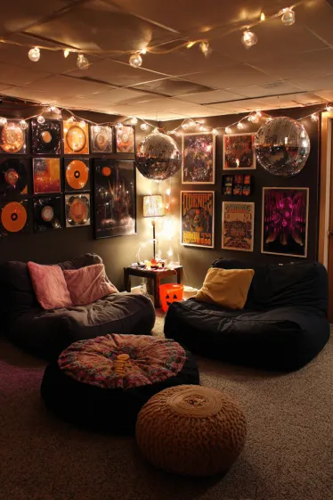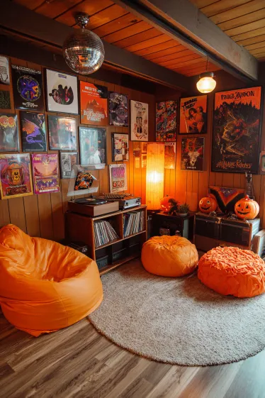 This super fun room is absolutely bursting with retro charm, creating the ultimate Halloween hangout spot. The dark walls are a fantastic backdrop for a vibrant gallery of vintage posters, some showcasing spooky or music-themed artwork, alongside an awesome display of framed vinyl records. Overhead, a string of whimsical globe lights and sparkling disco balls add a playful, festive glow. The seating is all about comfort with plush bean bag chairs and textured floor poufs, inviting everyone to kick back and relax. A side table holds a lamp and a classic pumpkin pail, completing this wonderfully eclectic and cozy space.
