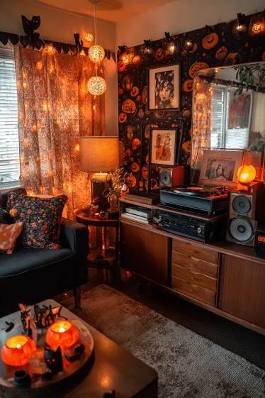 This absolutely enchanting room is a treasure trove of retro Halloween magic, truly embracing a cozy and inviting atmosphere. One wall is a delightful explosion of playful pumpkin-themed wallpaper, beautifully adorned with framed vintage-style art. The windows are dressed in sheer orange curtains that twinkle with delicate string lights, casting such a warm and ethereal glow. A comfy dark sofa is piled high with decorative pillows, while a charming side table holds a warm lamp and more festive accents. A vintage console, complete with a record player and speakers, sits beneath a mirror, reflecting all the twinkling lights and adding to the nostalgic charm. On the coffee table, a beautiful tray holds glowing pumpkin-shaped candle holders and adorable black cat figures, perfectly completing this wonderfully eclectic and festive space.