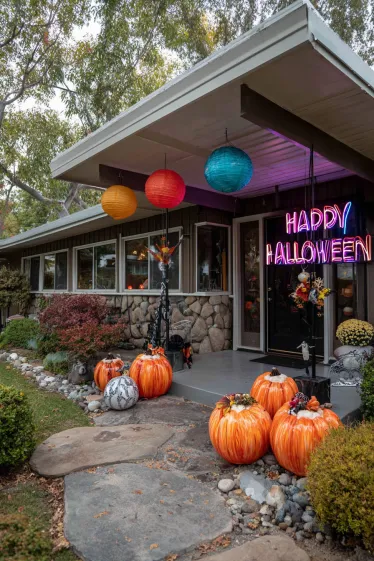 This super cool mid-century modern home, with its sleek low-pitched roof and a fantastic mix of stone and wooden siding, truly embraces Halloween with such a vibrant and playful spirit. The covered entryway is a burst of color, featuring bright orange, red, and turquoise paper lanterns hanging overhead. You absolutely can’t miss that amazing “Happy Halloween” neon sign, glowing in electric pink and blue, creating such a fun retro vibe right at the front door! A winding stone path leads to the entrance, beautifully lined with a cheerful assortment of textured orange and white pumpkins, all nestled among the lush landscaping. Spooky-chic branch decorations on the railing add just the right touch of creepy elegance to this wonderfully eclectic display.