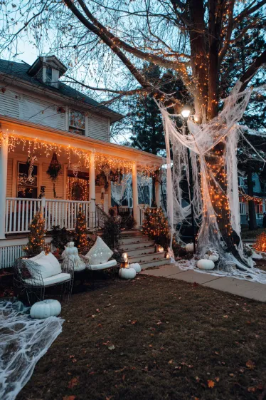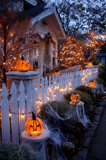 This delightful white house, with its charming gabled roof and inviting front porch, truly transforms into a Halloween dreamscape! The classic white picket fence is absolutely draped in ghostly white cobwebs, setting such an eerie yet elegant scene. Everywhere you look, warm orange string lights twinkle magically on the trees and along the fence, casting a cozy glow. Glowing jack-o’-lanterns are playfully perched on stone pedestals and nestled amongst the bushes, while more cobwebs spread their delicate tendrils. Even a little white ghost peeks out from the porch roof, completing this wonderfully spirited and inviting autumn display.