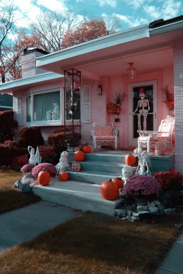 This absolutely delightful mid-century modern home, painted in the most charming shade of bubblegum pink, is a true vision of retro Halloween fun! Its classic bay window and inviting front porch, complete with dainty white wrought iron furniture, set such a whimsical scene. The entrance is a playful blend of spooky and sweet, featuring friendly skeletons, bright orange pumpkins, and lush purple mums cascading around the steps and landscaping. It’s such a unique and cheerful take on Halloween decor that perfectly embraces its vintage charm.