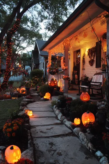This lovely two-story home, with its crisp white siding and classic dark shutters, creates such an inviting canvas for festive autumn decor. The expansive front porch, adorned with pristine white railings and columns, is absolutely draped in a cascade of warm orange string lights, extending a cheerful glow. A magnificent tree in the front yard also twinkles with countless orange lights, making the entire scene feel magical. A winding stone path leads guests through the lush landscaping, beautifully illuminated by an array of glowing jack-o’-lanterns and charming small potted mums. The porch itself is filled with more glowing pumpkins and quaint hanging spooky elements, alongside a cozy rocking chair, making it the perfect spot for autumn evenings.