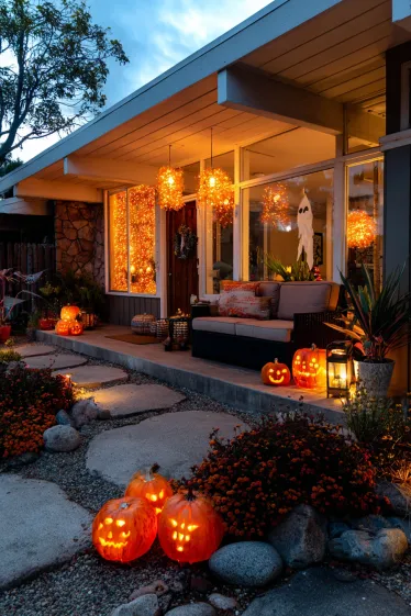 This absolutely fantastic mid-century modern home, with its sleek low-pitched roof and a cool mix of natural stone and warm wooden siding, truly knows how to celebrate Halloween with so much style! Expansive windows let in tons of light and reflect the gorgeous autumn evening. The covered entryway is a hub of cozy glows, featuring charming pendant lights hanging from the ceiling, casting such a soft, inviting ambiance. A winding stone pathway, beautifully bordered by river rocks and vibrant fall shrubs, leads to the entrance. Along this delightful path, you’ll discover an abundant display of glowing jack-o’-lanterns and smaller decorative pumpkins, adding cheerful pops of orange. On the porch, a comfy outdoor sofa and a friendly white ghost figure complete this wonderfully eclectic and welcoming scene.