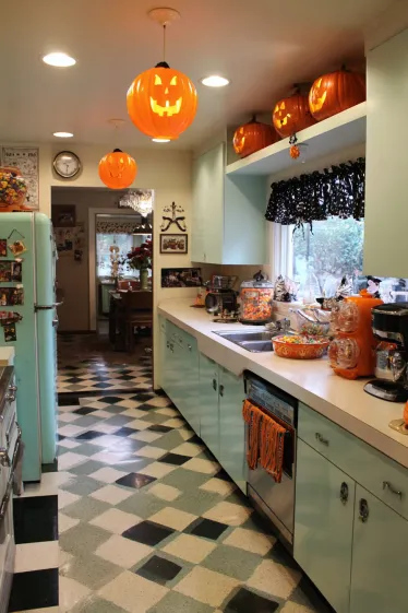 This absolutely darling kitchen is a total vintage dream with its charming light blue cabinets and classic black and white checkerboard floor, instantly giving it such a fun, retro diner feel. Overhead, cheerful pumpkin-shaped pendant lights cast a warm, inviting glow, perfectly complemented by more glowing pumpkins adorning the top of the cabinets. A vintage-style mint green refrigerator adds another delightful pop of color and nostalgia. The window is dressed with a cute black polka-dot valance, and the countertops are bustling with festive treats and more adorable pumpkin decorations, making this space feel wonderfully ready for a Halloween celebration.