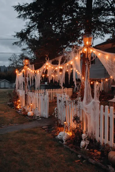 This delightful home creates such a wonderfully spooky entrance with its classic white picket fence, completely draped in eerie white cobwebs and twinkling with warm string lights. Lanterns with flickering candles and cheerful pumpkins are nestled along the fence line and winding pathway, casting such an inviting glow. Scattered skeletons peek out from the foliage, adding a playfully creepy touch to the garden beds. A large, majestic tree in the front yard is also adorned with a magical web of lights and more dramatic cobwebs, making the entire scene feel like a beautifully haunted wonderland as evening falls.