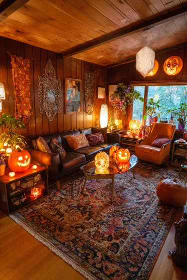 This absolutely gorgeous living room is a total autumn dream, with its warm wood-paneled walls and ceiling creating such a wonderfully inviting and rustic backdrop. A super comfy dark leather sofa, piled high with an array of patterned pillows, looks so inviting, and a charming vintage orange armchair adds a pop of cheerful color. The low coffee table, with its unique mirrored top, is beautifully adorned with grinning jack-o’-lanterns, a sparkling skull light, and glowing candles, casting such a magical, flickering light. The entire space feels grounded by a magnificent, richly patterned rug, while various lamps provide soft, warm illumination, making it feel perfectly cozy and ready for fall.