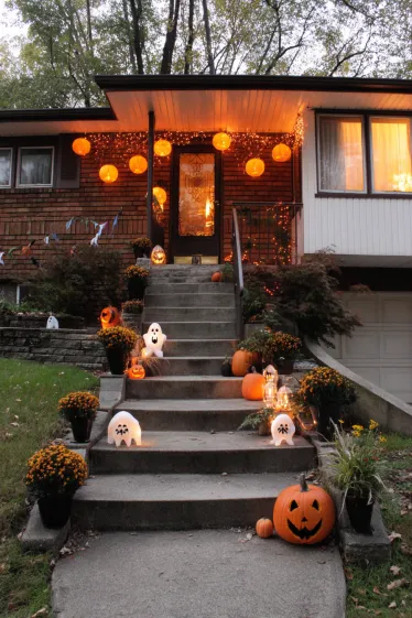 This absolutely charming mid-century modern home, with its cool low-pitched roof and a mix of classic brick and light-colored siding, truly transforms into a playful Halloween paradise! The front porch is a burst of warmth, draped with sparkling orange string lights and adorned with delightful round orange lanterns, creating such a cheerful glow. A whimsical stone pathway leads up to the entrance, beautifully lined with a parade of glowing jack-o’-lanterns, adorable ghost figures, and lush potted mums in rich autumn hues. Even a little white ghost peeks out from the side, adding such a sweet, spooky touch. It’s a wonderfully eclectic and inviting display that perfectly captures that fun, retro Halloween spirit.